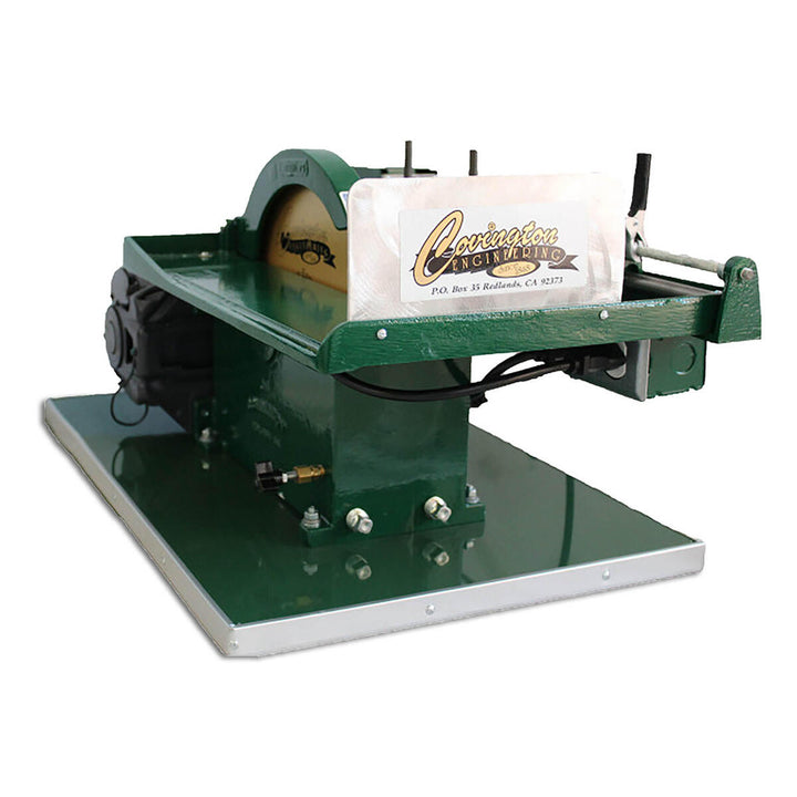 Covington's 10" Trim Saws cut rocks, minerals, and glass. Ball bearing arbor assembly has grit slinger to protect precision bearings. Trim saws feature Covington's unique "Koolerant Kontrol" valve which virtually eliminates splash. Valve "C" adjusts the flow from reservoir "A" into blade compartment "B" to maintain proper coolant levels. Excess coolant from cutting area returns to the reservoir. Twin drains allow easy cleaning of sump. The weight feed unit ships complete with weight feed accessories and motor ready to operate. NOTE: the weight feed unit does not come with a lam-i-cushion base or hood. Unit must be mounted to a sturdy surface. Weight feed accessories include nylon cord and scale to determine weight on vise feed. Unit ships assembled with motor, operating instructions, and product guarantee.