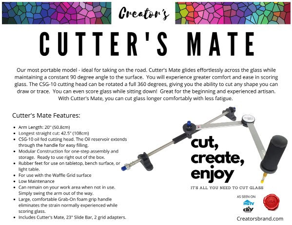 The cutters mate is an excellent scoring tool with a cutting head that can be rotated 360 degrees. This gives you the ability to cut any shape you can draw. It has easy one step assembly. The rubber feet on it allow for use on tabletop, bench surface, or a light table. This very low maintenance making it very good and easy to use for cutters of all experience levels. Weighs 7lb. SPECIFICATIONS: Arm Length: 21" (53.34 cm) Longest straight cut: 62.5" (158.75)