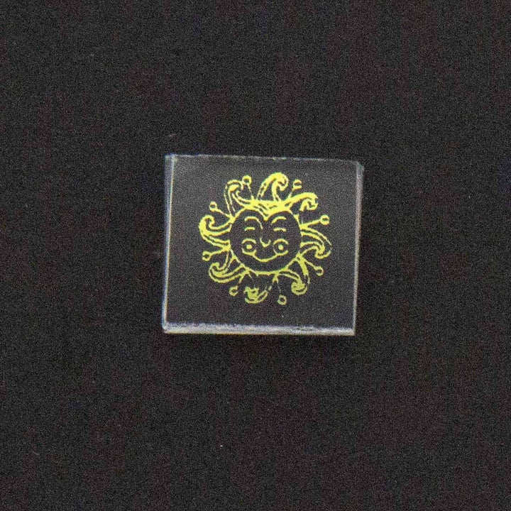 The Ethnic Sun Image is on a _” square of 33 COE glass. The distinctly clean, laser-etched image is typically done on a Blue Gold dichroic coating by CBS. The color may vary. We can offer custom sizes of in house images with minimum order quantities of 50 pieces of _” and 25 pieces of 1” images. Please call us for more information about custom images.