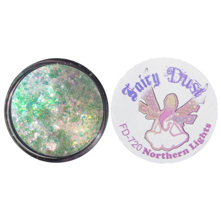Fairy Dust is high temperature flakes that refract like dichroic glass! These jars of flakes hold actual material weight is 1.5 grams of fairy dust that has a particle size between 100-2000µ. Northern Lights refracts shimmering pinks and greens. These flakes are compatible with 104 COE, 96 COE, and 33 COE glass.