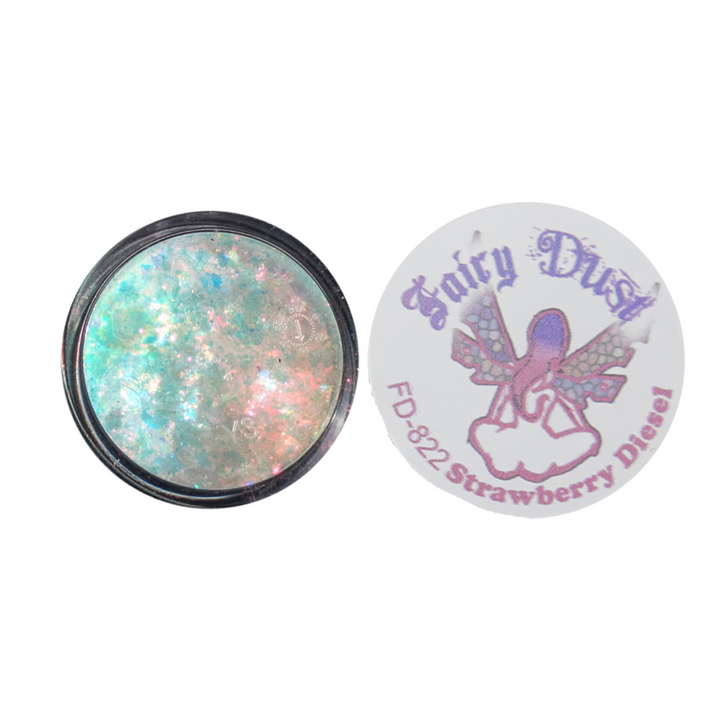 Fairy Dust is high temperature flakes that refract like dichroic glass! These jars of flakes hold actual material weight is 1.5 grams of fairy dust that has a particle size between 100-2000µ. Strawberry Diesel refracts shimmering magenta, red, and yellow. These flakes are compatible with 104 COE, 96 COE, and 33 COE glass. Flameworked Video General Fusing Video