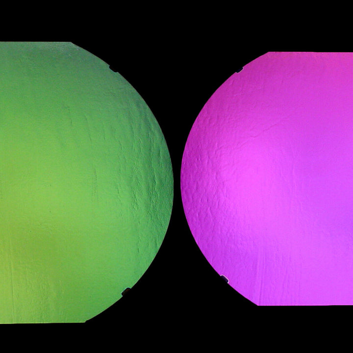 Two vibrant shades are exhibited in this 1/16" Thick Dichroic glass plate; a base of vivid Green with a transmitting color of deep Magenta. Full Dichroic Sheets measure approximately 19" x 16" Diameter in an Oval shape. Check out this Dichroic color in a Full, Half, or Quarter size sheet. ( For more Information about our Dichroic Glass & Services, Check Out ABR's DICHROIC Information Pull-Tab at the Top Right Side of our Homepage)