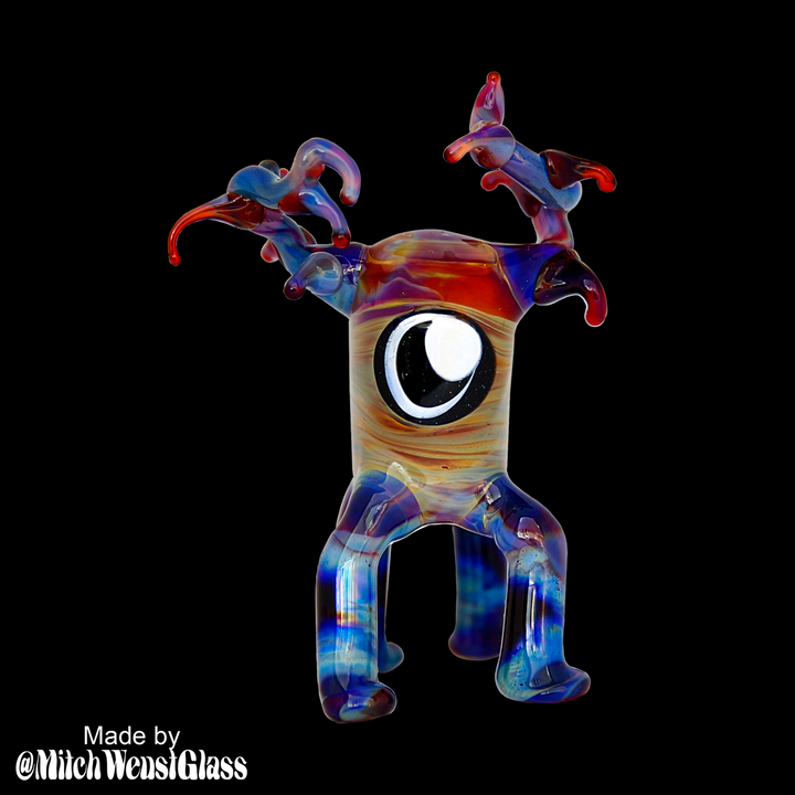 Striking Borealis Purple is doped with a ton of silver to get the crazy striking colors shown. I mainly used an oxygenating flame on this but I found that this color responds more to temperature than it does to flame chemistry. The tan colors of the body were worked in the flame much longer than the other sections. I would love to see some implosions using this one. - MW