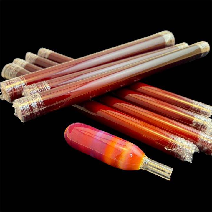 Loki’s Lipstick is a close companion to NS-13 Amber Purple but with a little more control of the color strike. Work in an oxidizing flame to achieve the most vivid color range. It can be struck in the torch or in the kiln. You can achieve colors that look like gold and silver fume as well as deep purples. For best results, we recommend using an aggressive sharp and oxidizing flame to burn off the initial metallic haze on the surface.