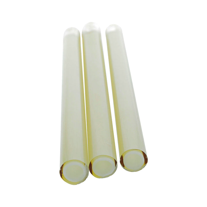 This triple dip WonderTubing consistent of one layer of NS-13 Amber/Purple over two layers of NS-54 Star White. Both flame and color stable, this color combination can be worked in any type of flame. For best results, we recommend using an aggressive sharp and oxidizing flame to burn off the initial metallic haze on the surface. This color can be flame struck or kiln struck.